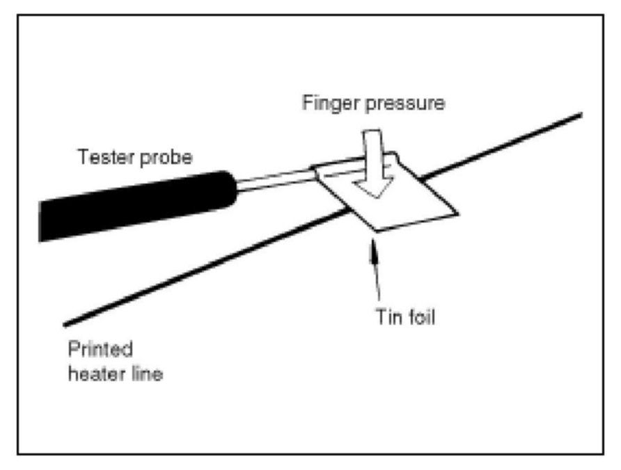 CAUTION: Wrap tin foil around the end of the voltmeter test lead to prevent damaging the heater line. Apply finger pressure on the tin foil, moving the tin foil along the grid line to check for open circuits.