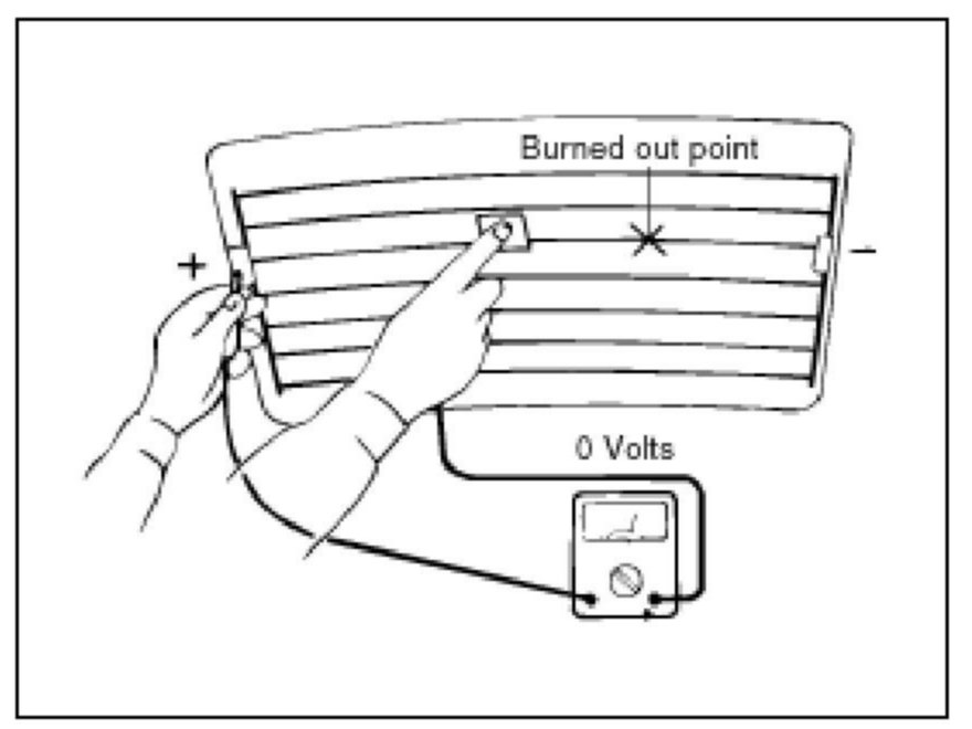 5. Use an ohmmeter to measure the resistance of each heater line between a terminal and the center of a grid line, and between the same terminal and the center of one adjacent heater line. The section with a broken heater line will have a resistance twice as that in other sections. In the affected section, move the test lead to a position where the resistance sharply changes.