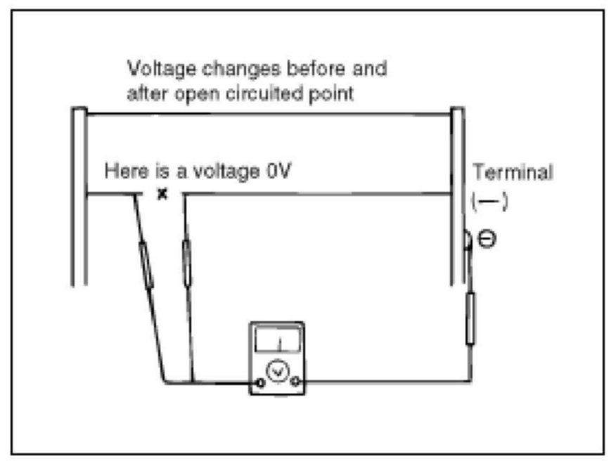 4. To check for open circuits, slowly move the test lead in the direction that the open circuit seems to exist. Try to find a point where a voltage is generated or changes to 0 V. The point where the voltage has changed is the open-circuit point.