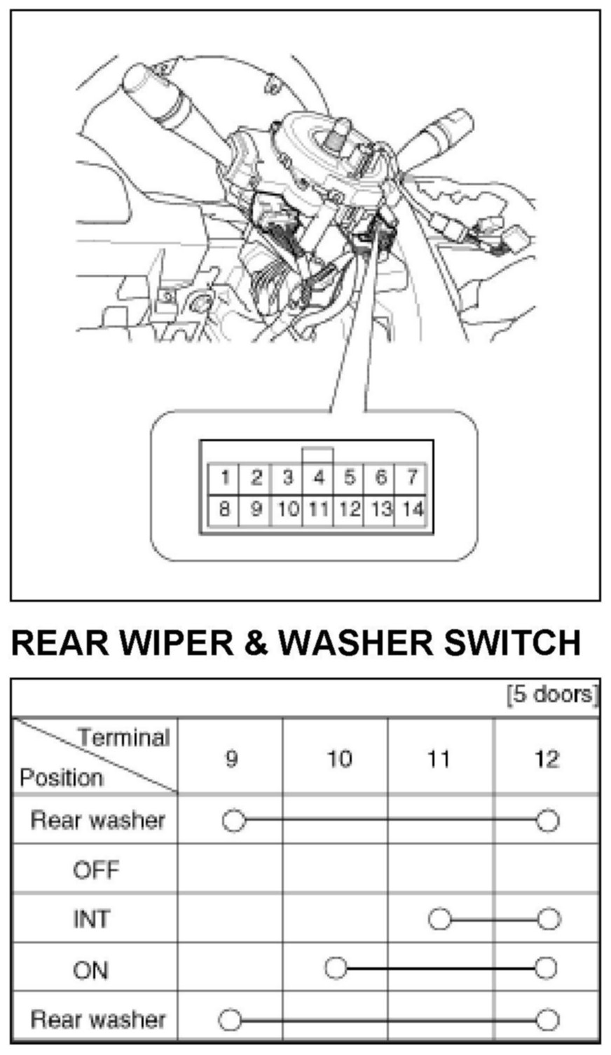With the rear wiper & washer switch in each position, make sure that continuity exists between the terminals. If continuity is not as specified, replace the multifunction switch.