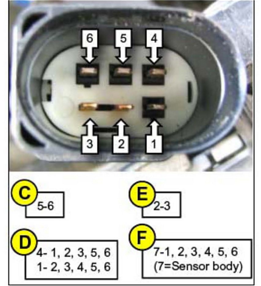 4. Measure the resistances between the terminals of the male connector of front oxygen sensor at room temperature (70°F) and record them on the check sheet.