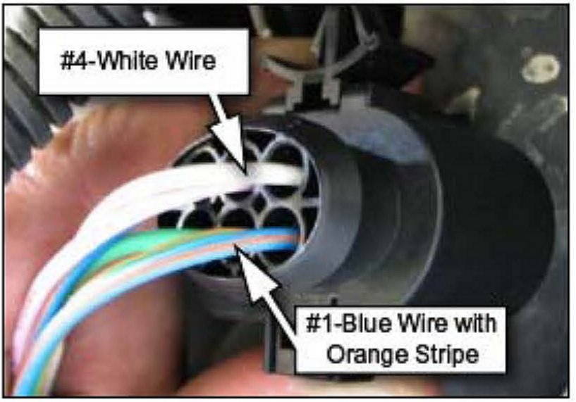 9. Remove the two terminals # 1 (Blue with orange stripe) and # 4 (White) using a two blade terminal removal tool. Locations of terminals 1 and 4 are shown in the picture above.