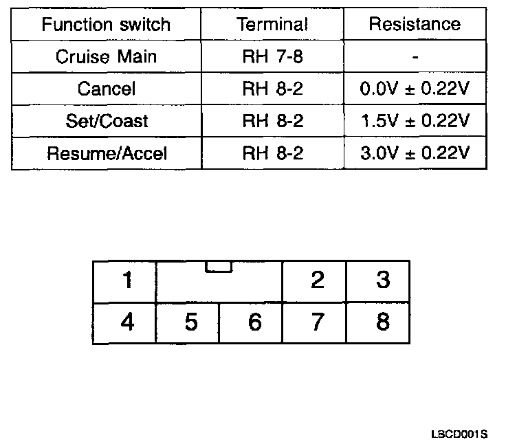 2. Measure resistance between terminals on the control switch when each function switch is ON (switch is depressed).