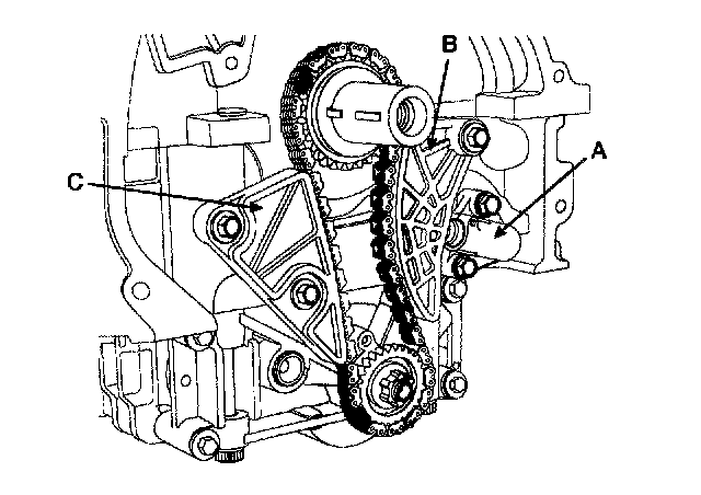 Crankshaft sprocket (A) -> Timing chain guide (B) Intake camshaft sprocket (C) -> Exhaust camshaft sprocket (D).