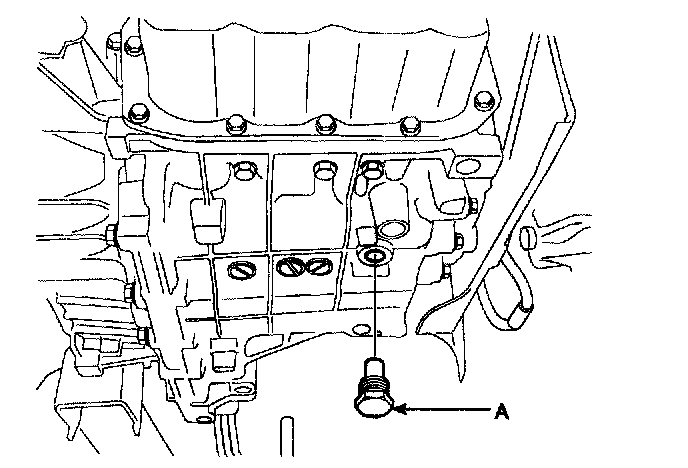3. Remove the drain plug (A) from the bottom of the transmission case to drain the fluid.