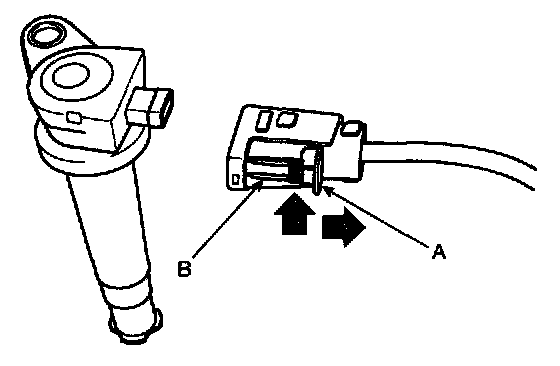 NOTE: When removing the ignition coil connector, pull the lock pin (A) and push the clip (B).