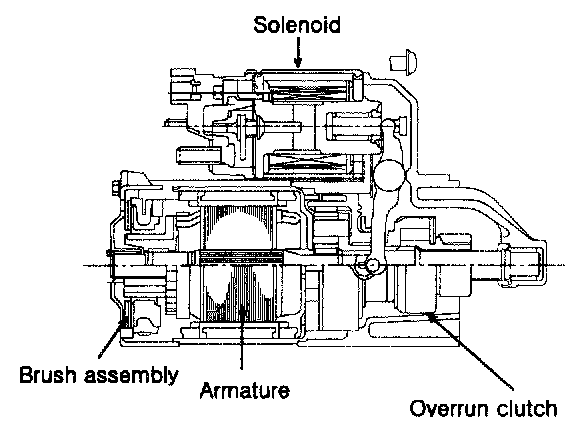 The contacts close and the starter motor cranks. In order to prevent damage caused by excessive rotation of the starter armature when the engine starts, the clutch pinion gear overruns.