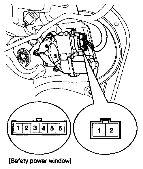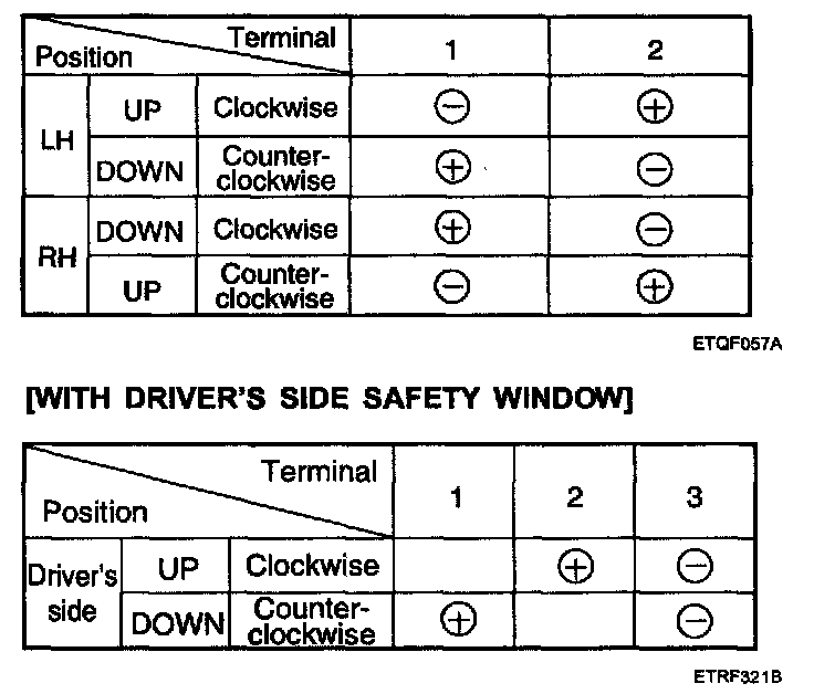 3. Connect the motor terminals directly to battery voltage (12 V) and check that the motor operates smoothly. Next, reverse the polarity and check that the motor operates smoothly in the reverse direction. If the operation is abnormal, replace the motor.