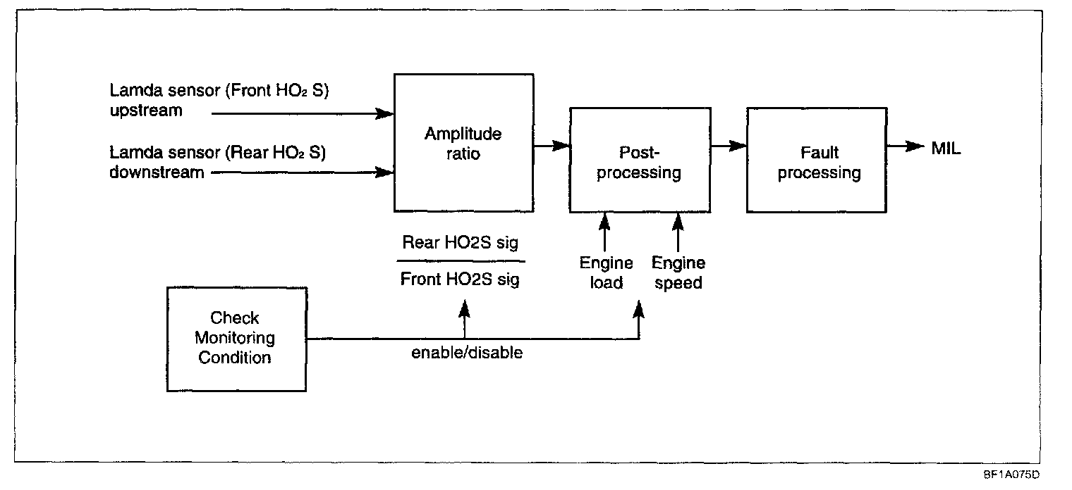 To comply with clean air regulations, vehicles are equipped with catalytic converters. These converters reduce the emissions of hydrocarbons, oxides of nitrogen and carbon monoxide. Normal vehicle operation or engine misfire can cause a catalyst to decay. A meltdown of the ceramic core can cause a reduction of the exhaust passage resulting in an increase in vehicle performance and deteriorate engine performance, driveability and fuel economy. The catalyst uses dual oxygen sensor to monitor the efficiency of the converter because as a catalyst deteriorates, its oxygen storage capacity and its efficiency are both reduced. By monitoring the oxygen storage capacity of a catalyst, its efficiency can be indirectly calculated. The upstream (front) HO2 Sensor is used to detect the amount of oxygen in the exhaust gas before it enters the catalytic converter. A low voltage indicates a high oxygen content (lean air mixture) A high voltage indicates a low content of oxygen (rich mixture). When the front HO2 Sensor detects a lean condition, there is an abundance in the oxygen in the exhaust has. A functioning converter would store this oxygen so it can use it for the oxidation of HC and CO. As the converter absorbs the oxygen, there will be a lack of oxygen downstream of the converter. The output of the downstream (rear) HO2 Sensor will indicate limited activity in this condition. As the converter loses the ability to store oxygen, the condition can be detected from the operation of the rear HO2 Sensor. When the catalyst efficiency drops, no chemical reaction takes place. This means the concentration of oxygen will be the same downstream (rear) as upstream (front). The output voltage of the rear HO2 Sensor copies the voltage of the front HO2 Sensor. The only difference is a time lag (monitored by the ECM) between the switching of the HO2 Sensors. To monitor the system, the lean-to-rich switches of front to rear HO2 Sensors is counted. The ratio of rear switches to front switches is used to determine whether the catalyst is operating properly. An effective catalyst will have fewer rear switches than it has front switches, that is, a ratio closer to zero. For a totally ineffective catalyst, this ratio will be one-to-one indicating that no oxidation occurs in the catalytic converter. The system must be monitored so that when catalyst efficiency deteriorates and exhaust emissions increase to over the legal limit, the MIL will illuminate.