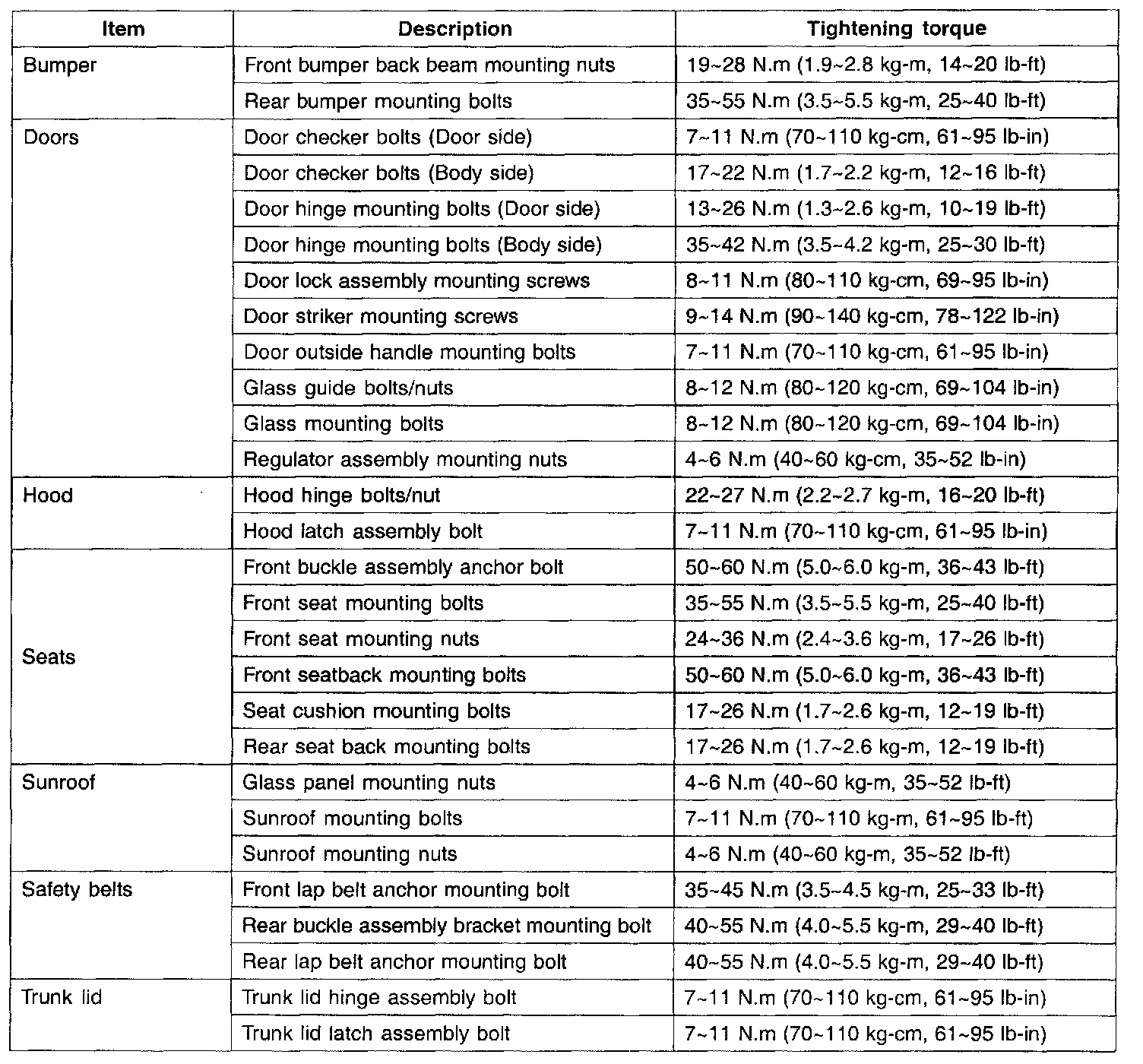 Tightening Specifications: