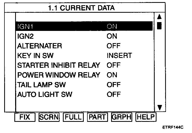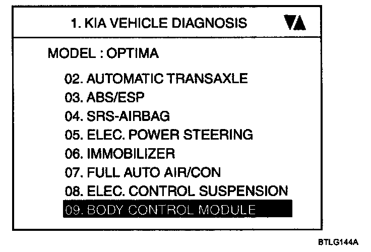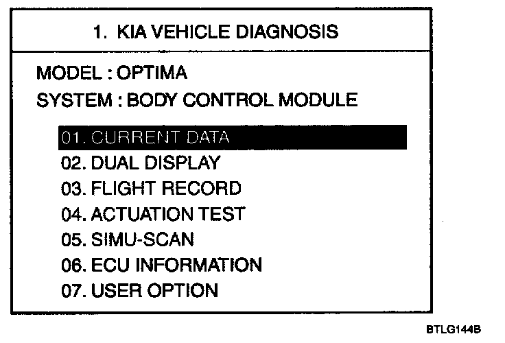 3. To consult the present input/out value of BCM, "02. INPUT/OUTPUT MONITORING". It provides information of BCM input/output conditions of power supply, turn signal/brake lamp, headlamp, door, locks, outside mirror, wiper, auto-light and transmitters etc.