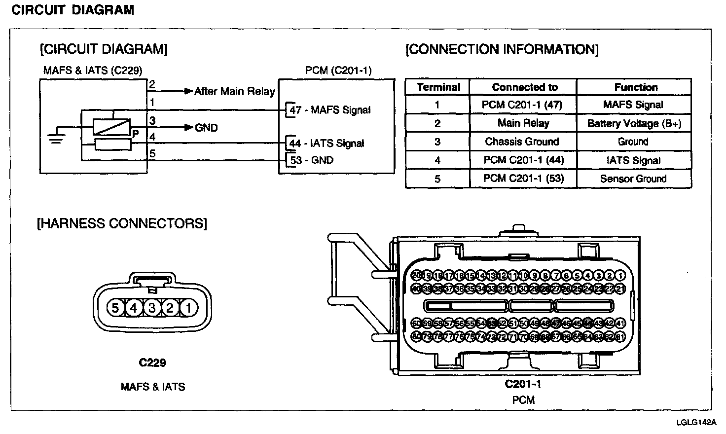 Mass Air Flow Sensor (MAFS) is a hot-film type sensor and is located in between the air cleaner and the throttle body. It consists of a tube, a sensor assembly and honeycomb cell and detects intake air quantity flowing into the intake manifold. Air flows from the air cleaner assembly through the honey comb cell and over the hot film element. At this time, heat transfer is generated by convection and this sensor loses its energy. This sensor detects the mass air flow by using the energy loss and transfers the information to the PCM by frequency. The PCM calculates fuel quantity and ignition timing.