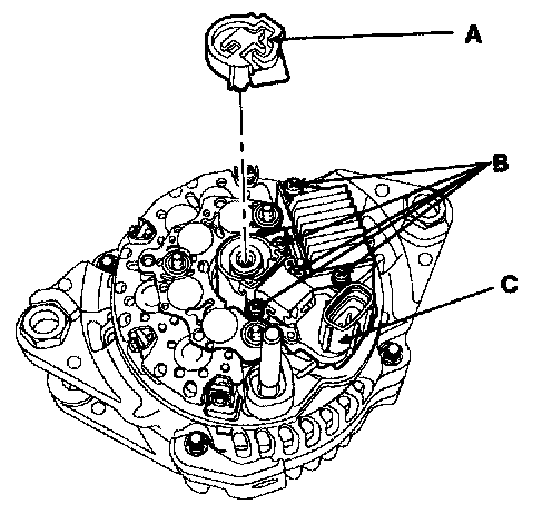 3. Loosen the mounting bolts (B) and disconnect the regulator assembly (C).