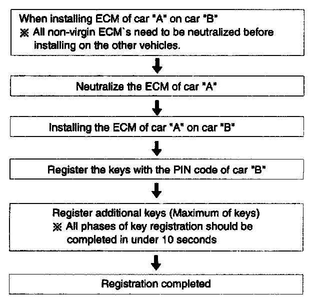 In case of a defective ECM, the unit has to be replaced with a "virgin" or "neutral" ECM. All keys have to be taught to the new ECM. Keys, which are not taught to the ECM, are invalid for the new ECM (Refer to key teaching procedure). The vehicle specific data have to be left unchanged due to the unique programming of transponder.