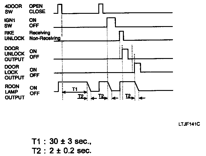 3. In the state that the Key is OUT (KEY IN SW=OFF), the Dr/As/RR door switch are close, if there is no change during 30 seconds after the TX Unlock is output, then the Hazard lamp output shall be ON for T2 at one time after the Lock is output for T1.