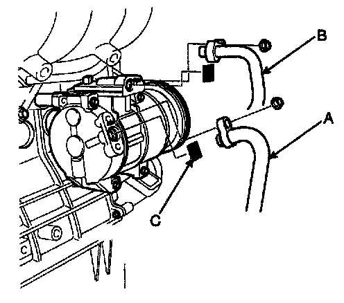 5. Remove the bolts, then disconnect the suction line (A) and discharge line (B) from the compressor. Plug (C) or cap the lines immediately after disconnecting them to avoid moisture and dust contamination.
