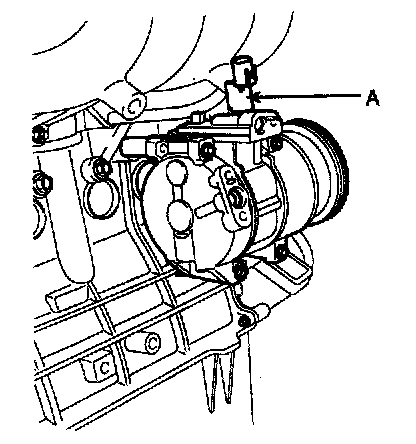 6. Disconnect the compressor clutch connector (A), and then remove 4 mounting bolts and the compressor.