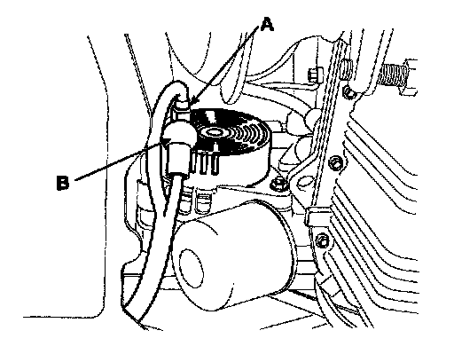 8. Disconnect the generator connector (A), and remove the cable (B) from generator "B" terminal.