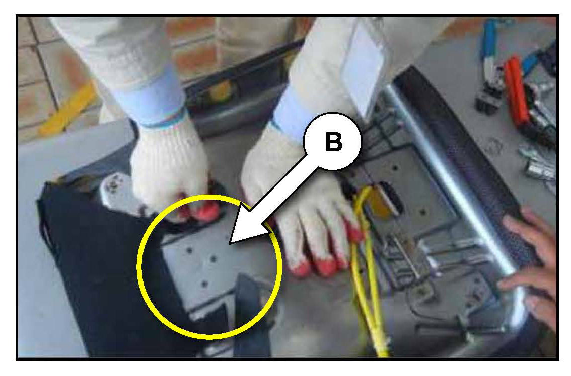 3. Undo the four (4) cushion covering hooks (B) under the seat cushion assembly.