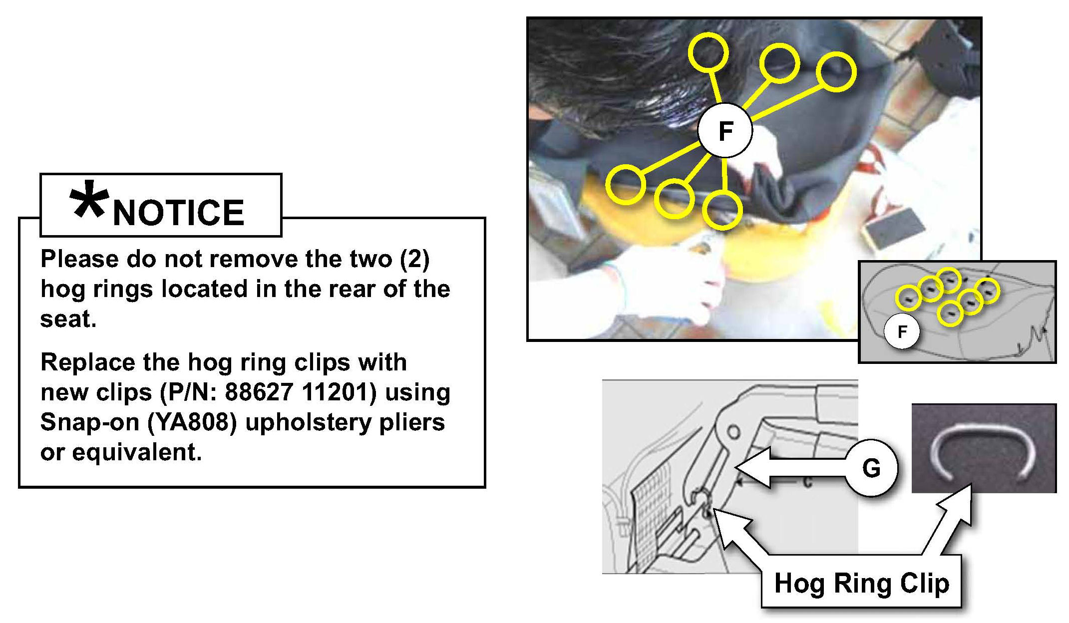 7. Fold back both bolster sides of the seat covering to gain access to the three (3) hog ring clips (F) on each side totaling six (6), then remove clips.