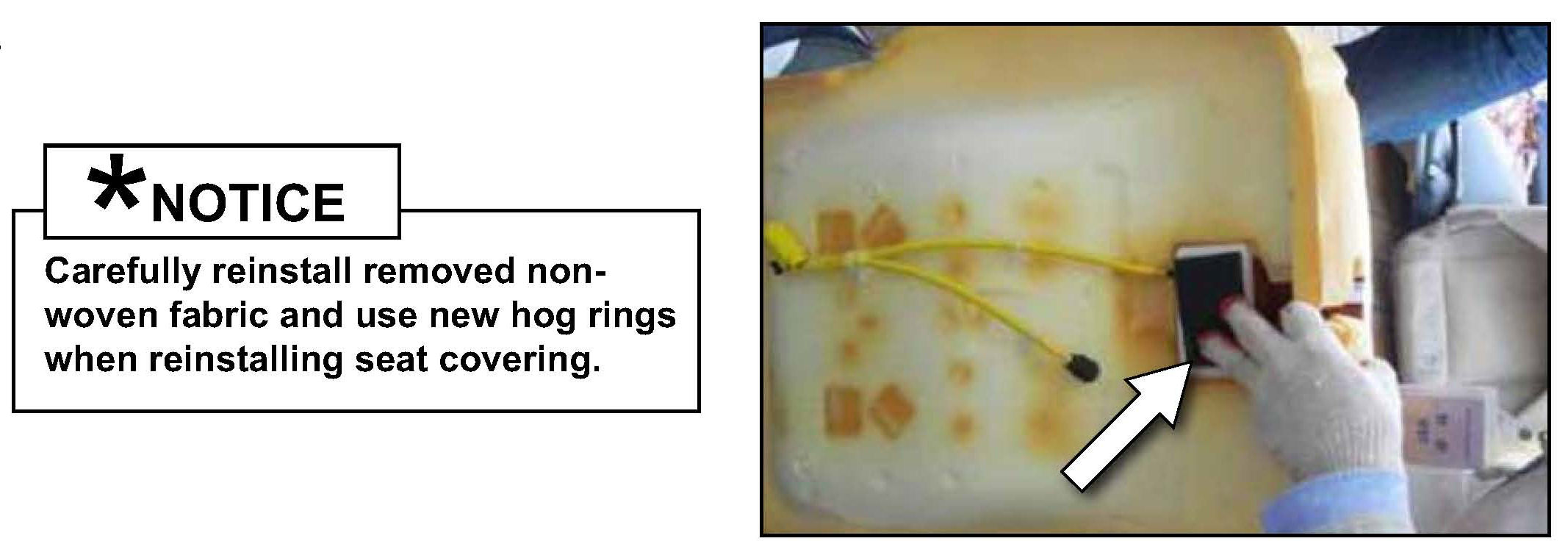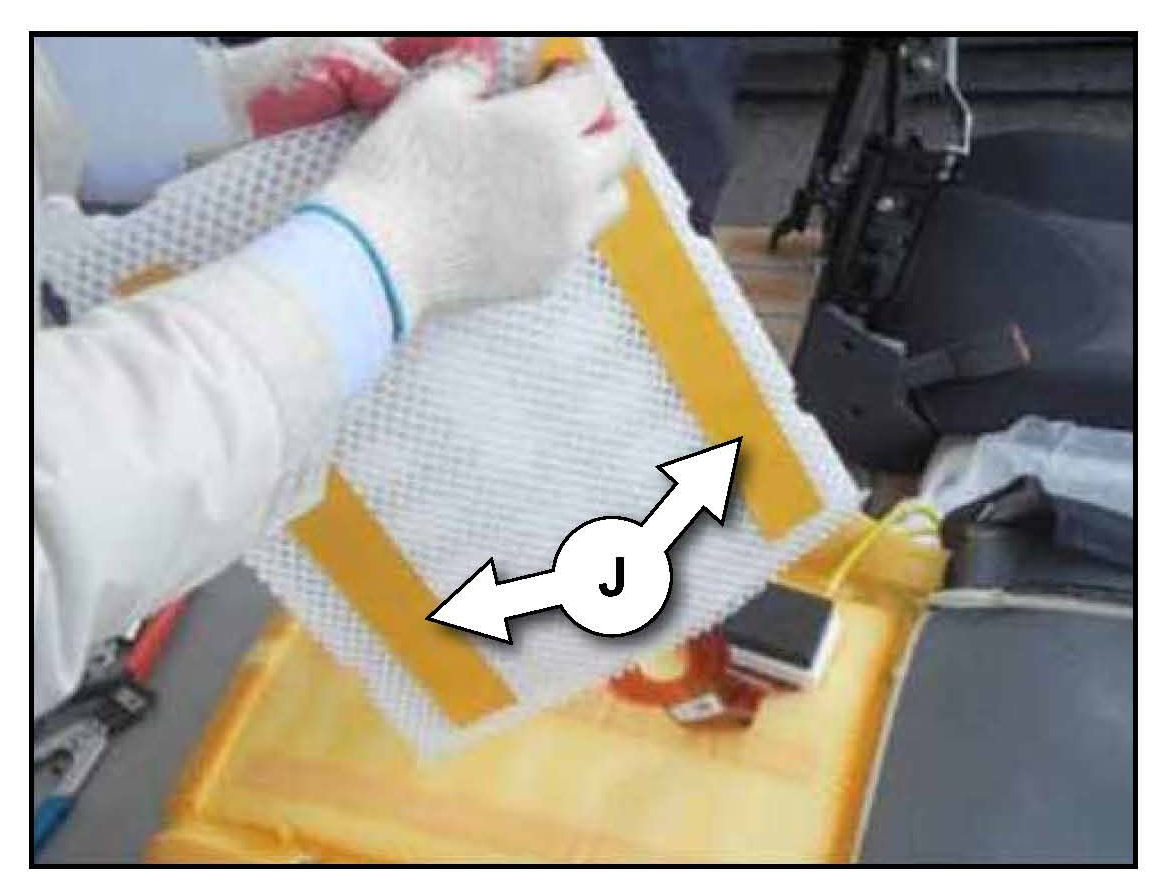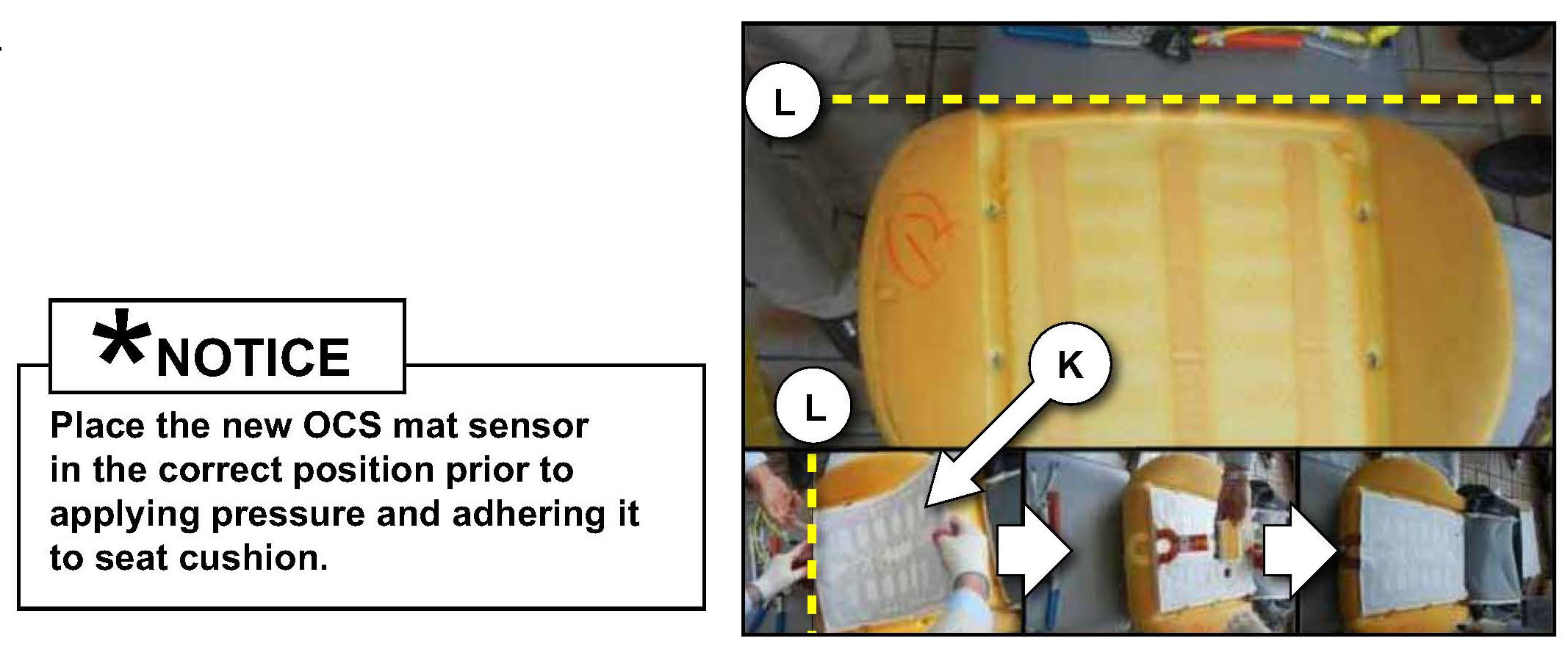 11. Attach the new OCS mat sensor (K) to the seat cushion, aligning the front side of the OCS mat sensor assembly to the front