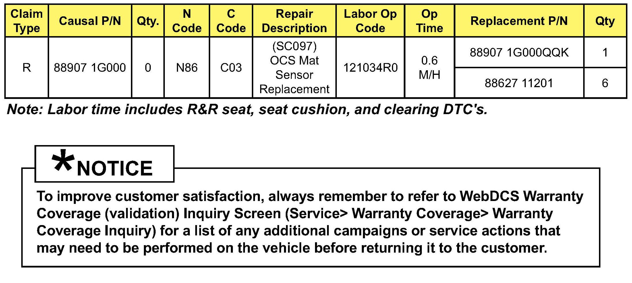 OCS MAT SENSOR REPLACEMENT - RIO PASSENGER SEAT (SC097)