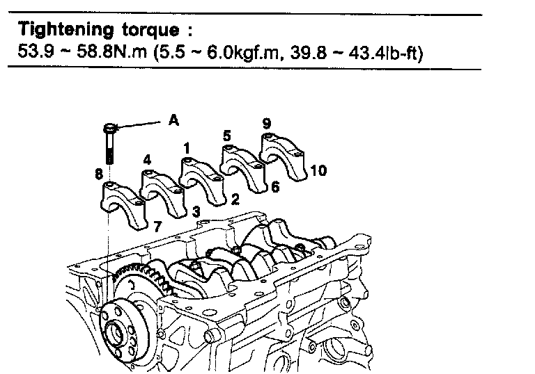 Install and uniformly tighten the 10 bearing cap bolts (A), in several passes, in the sequence shown.