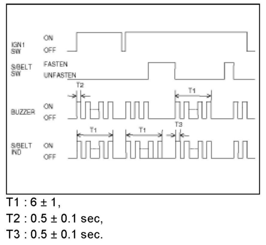 1. When the ignition is switched ON, the seat belt warning indicator will illuminate (period: 1.0 sec., duty rate : 50%) and the chime bell will sound (period: 1.0 sec., duty rate : 50%) for total of 6 seconds.