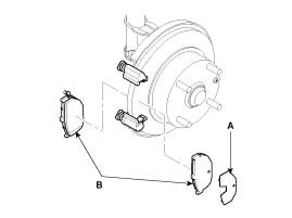 2. Check the foreign material at the pad shim (A) and the back of the pads (B).
