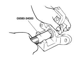 5. Remove the two guide rods (C) and caliper (D) from the bracket.