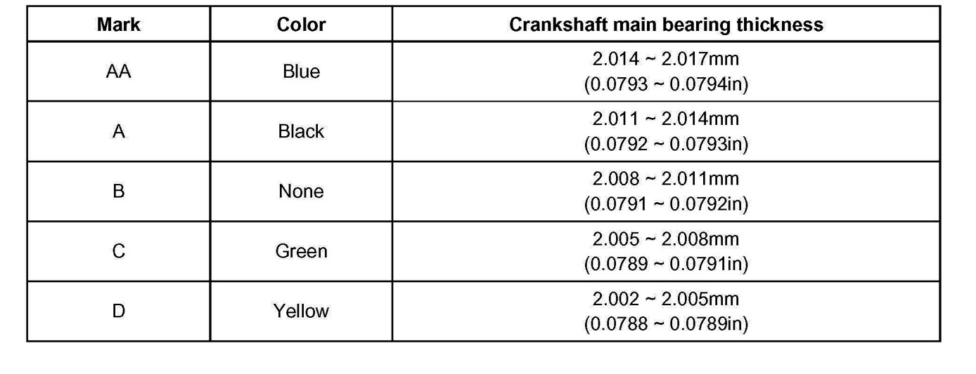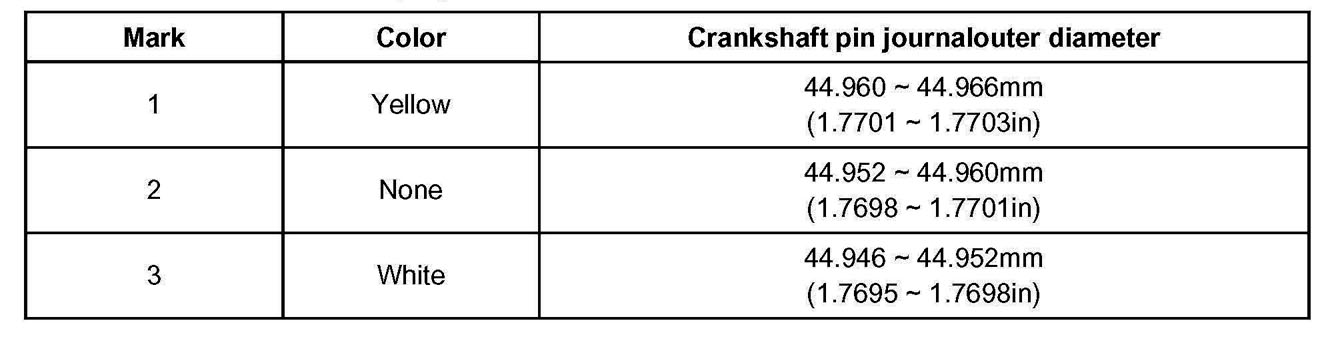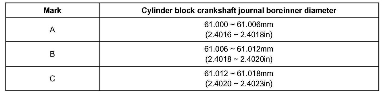 Main journal diameter: 56.942 - 56.962 mm (2.2418 - 2.2426 inch)