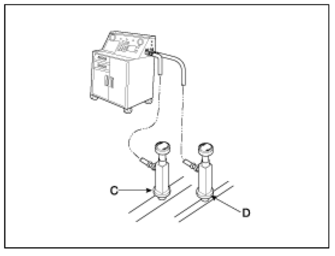 1. Connect a R-134 a refrigerant Recovery/Recycling/charging System to the high-pressure service port (B,D) and the low-pressure service port (A,C) as shown, following the equipment manufacturer's instructions.