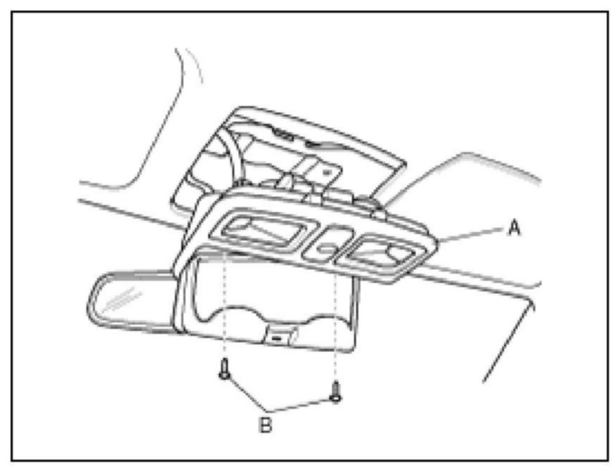3. Remove the overhead console lamp assembly (A) after removing 2 screws (B) and disconnecting the connector.