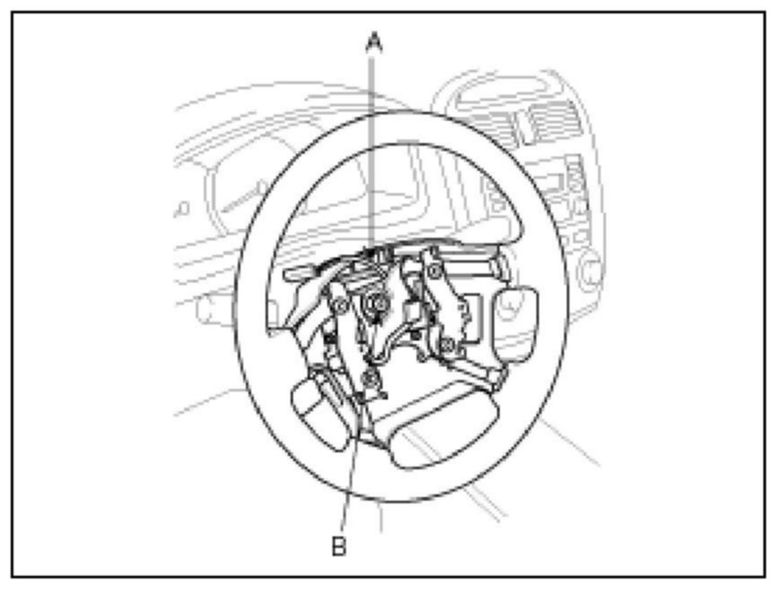3. Disconnect the horn connector and the air bag module connector, and remove the air bag module (B).