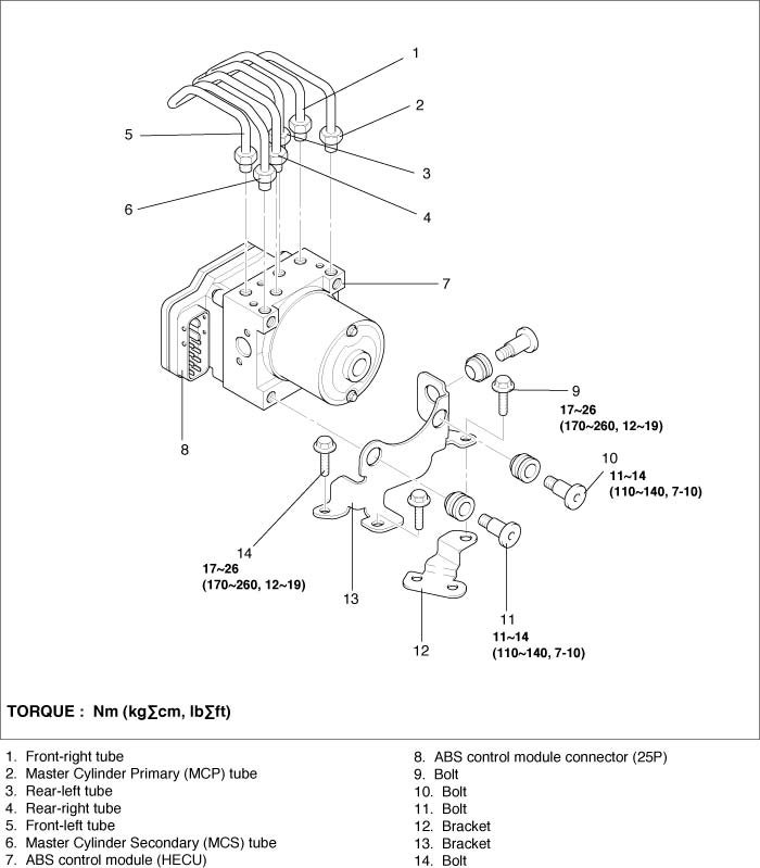 HECU bracket mounting bolt: 17 - 26 Nm (170 - 260 kg-cm, 12 - 19 ft. lbs.)