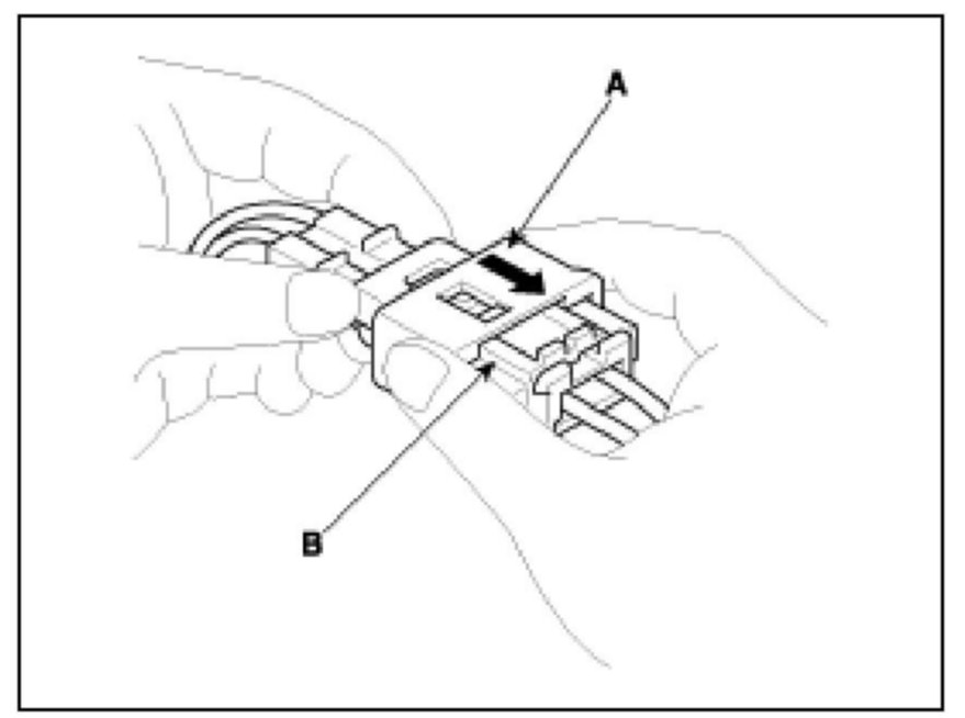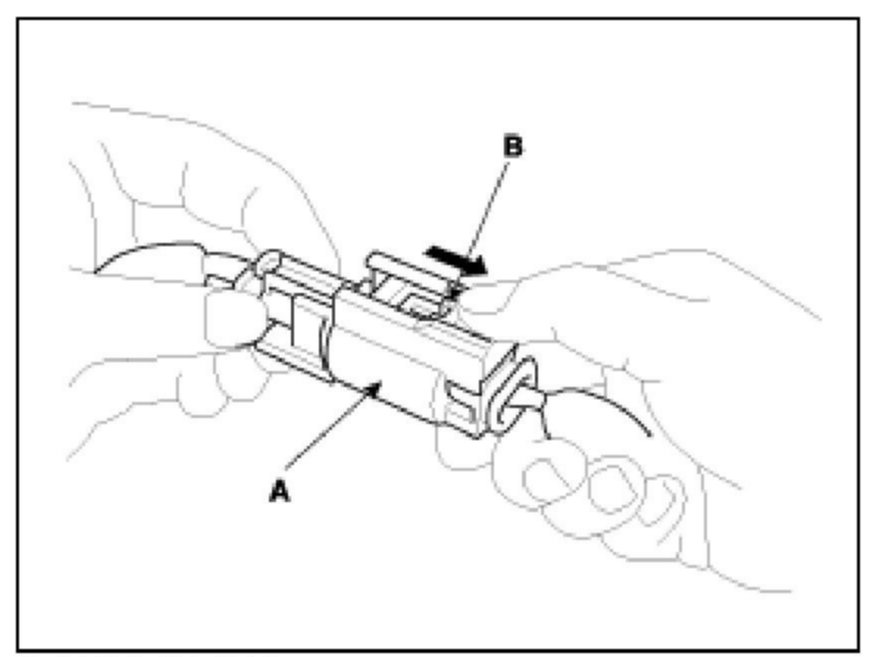 To release the lock, pull the spring-loaded sleeve (A) while pressing the slider (B) holding the opposite half of the connector. Pull the connector halves apart. Be sure to pull on the sleeve and not on the connector half.