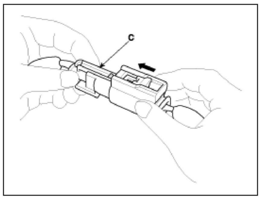 1. To reconnect, hold the pawl-side connector half, and press on the back of the sleeve-side connector half in the direction shown. As the two connector halves are pressed together, the sleeve (A) is pushed back by the pawl (C). Do not touch the sleeve.
