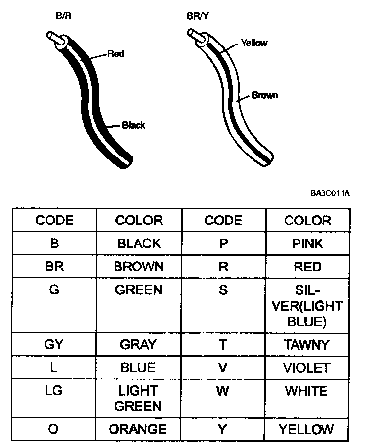 Two-color wires are indicated by a two-color code symbol. The first color indicates the base color of the wire; the second color indicates the color of the stripe.