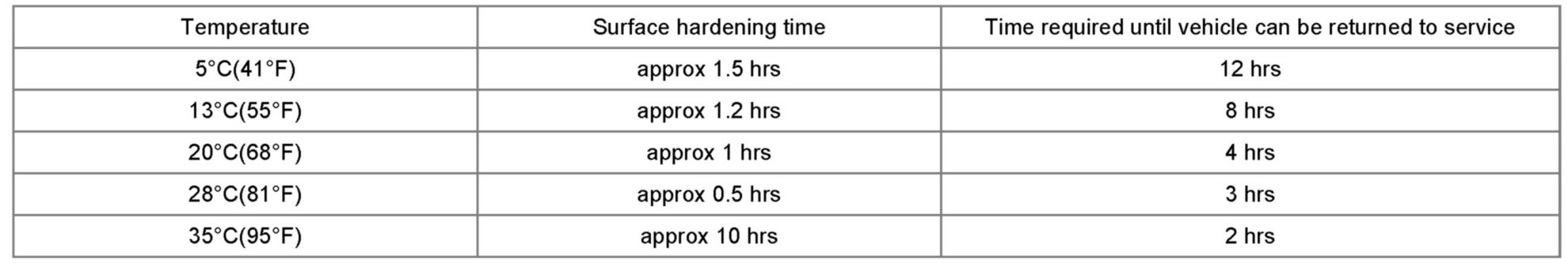 NOTE: The following cure times may be critical. Attempting to replace a windshield in ambient temperature over 35 degrees C (95 degrees F) should be avoided before completing the application.