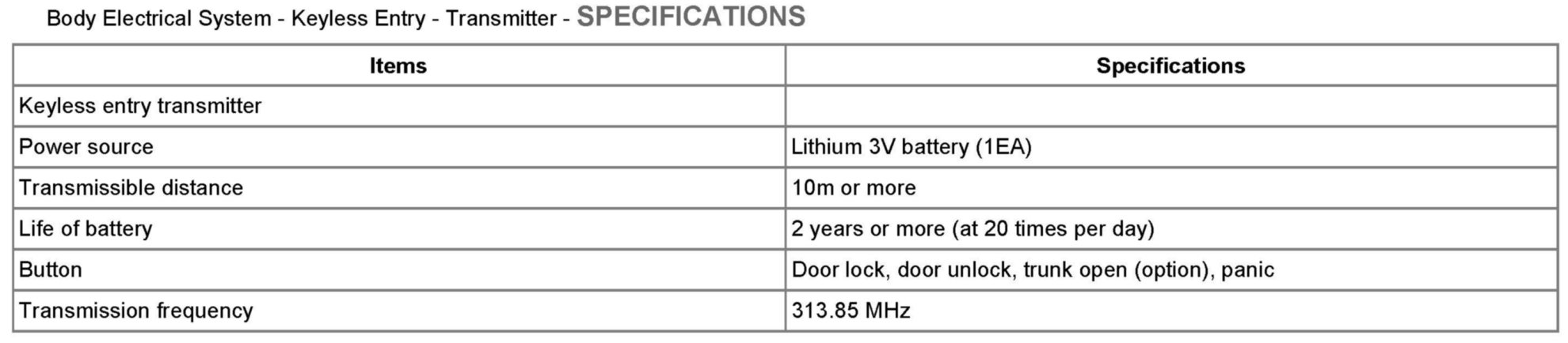 Keyless Entry Transmitter: Specifications