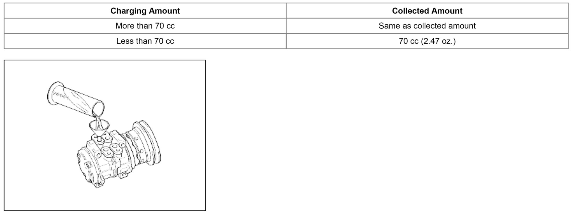6. Supply 70 cc (2.47 oz.) of oil to the compressor and install it onto the vehicle.