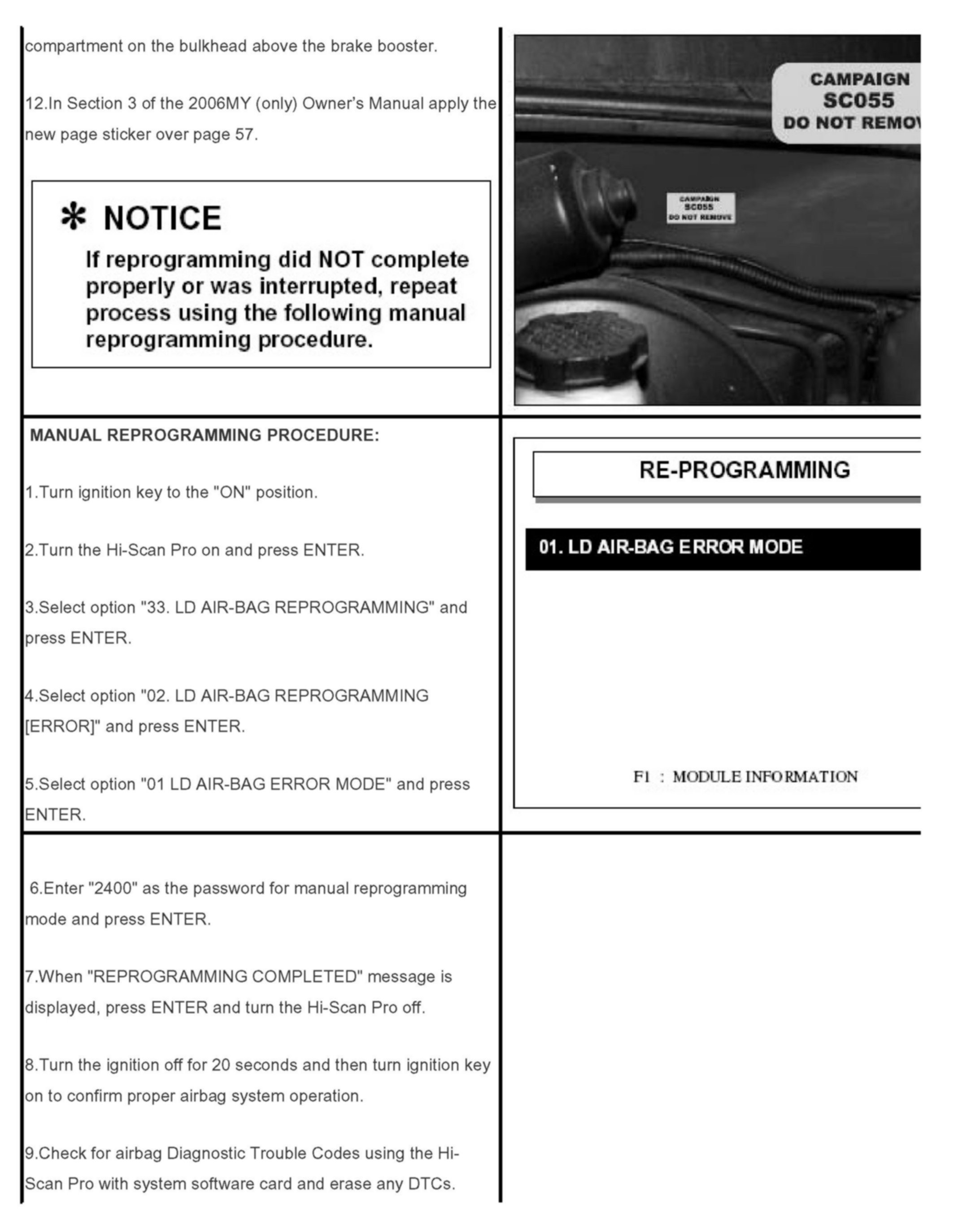 This bulletin modifies the prior TSB Campaign 055, dated October 2005 relating to the service campaign on 2004, 2005 and 2006MY LD Spectra, 2.0 liter vehicles with advanced airbag features within the production range from 12/11/03 through 10/10/05.