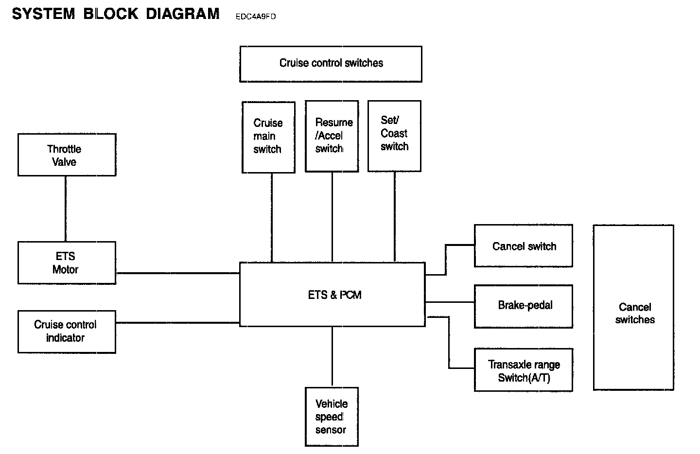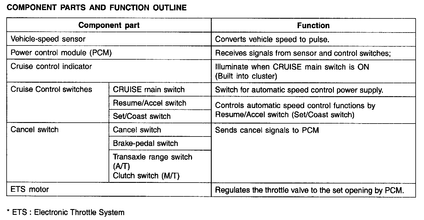 The main components of cruise control system are mode control switches, transaxle range switch, brake switch, vehicle speed sensor, ECM and ETS motor that connect throttle body.