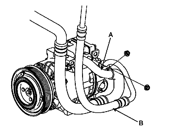 5. Remove the bolts, then disconnect the suction line (A) and discharge line (B) from the compressor. Plug (C) or cap the tines immediately after disconnecting them to avoid moisture and dust contamination.