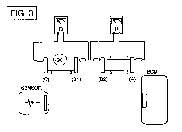 b. Disconnect connector (B), and measure for resistance between connector (C) and (B1) and between (B2) and (A) as shown in [FIG. 3].
