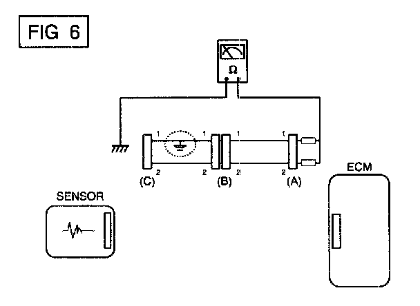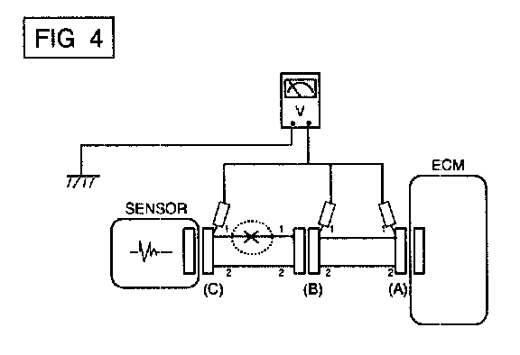a. With each connector still connected, measure the voltage between the chassis ground and terminal 1 of each connectors (A), (B) and (C) as shown in [FIG. 4].
