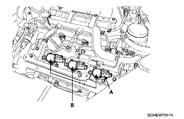 3. Remove the ignition coil connectors (A) and ignition coils (B).