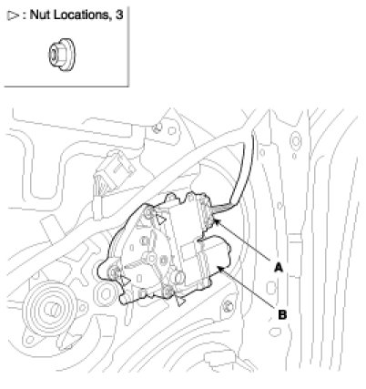 3. After disconnecting the connector (A), remove the power window motor (B).