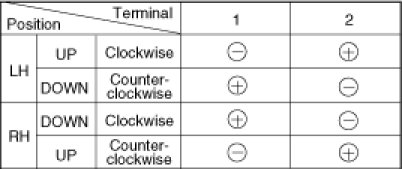 3. Connect the motor terminals directly to battery voltage (12V) and check that the motor operates smoothly. Next, reverse the polarity and check that the motor operates smoothly in the reverse direction. If the operation is abnormal, replace the motor.