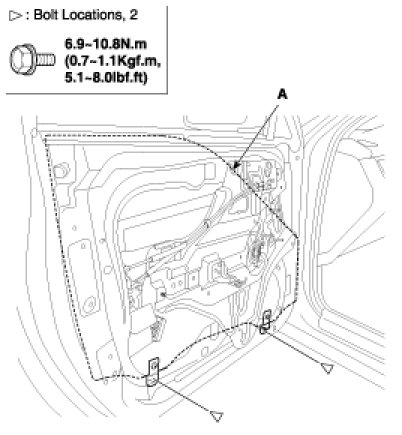 3. Carefully move the glass (A) until you can see the bolts, then loosen them. Separate the glass from the glass run and carefully pull the glass out through the window slot